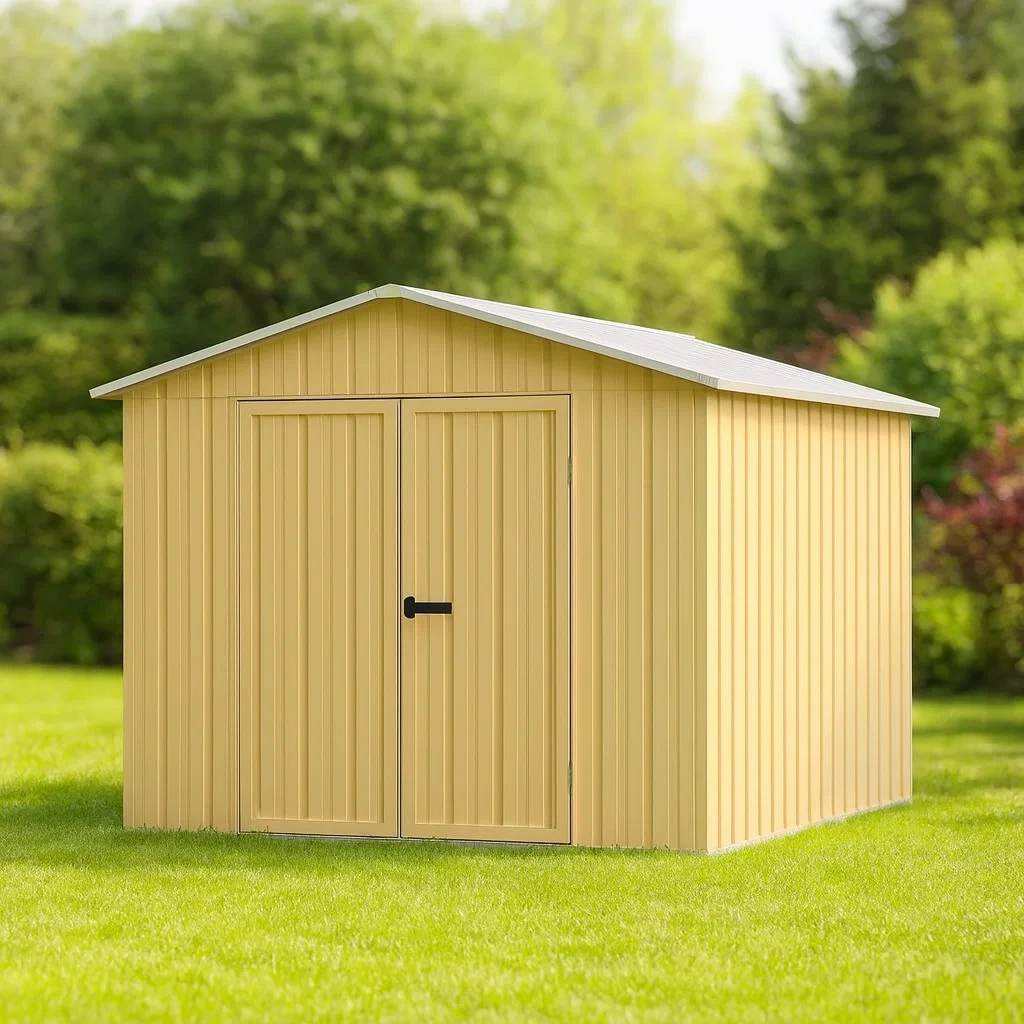 Abri de jardin en métal de couleur jaune avec portes doubles