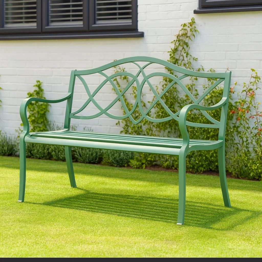 Ce banc est fabriqué en métal enduit de poudre résistant aux intempéries.